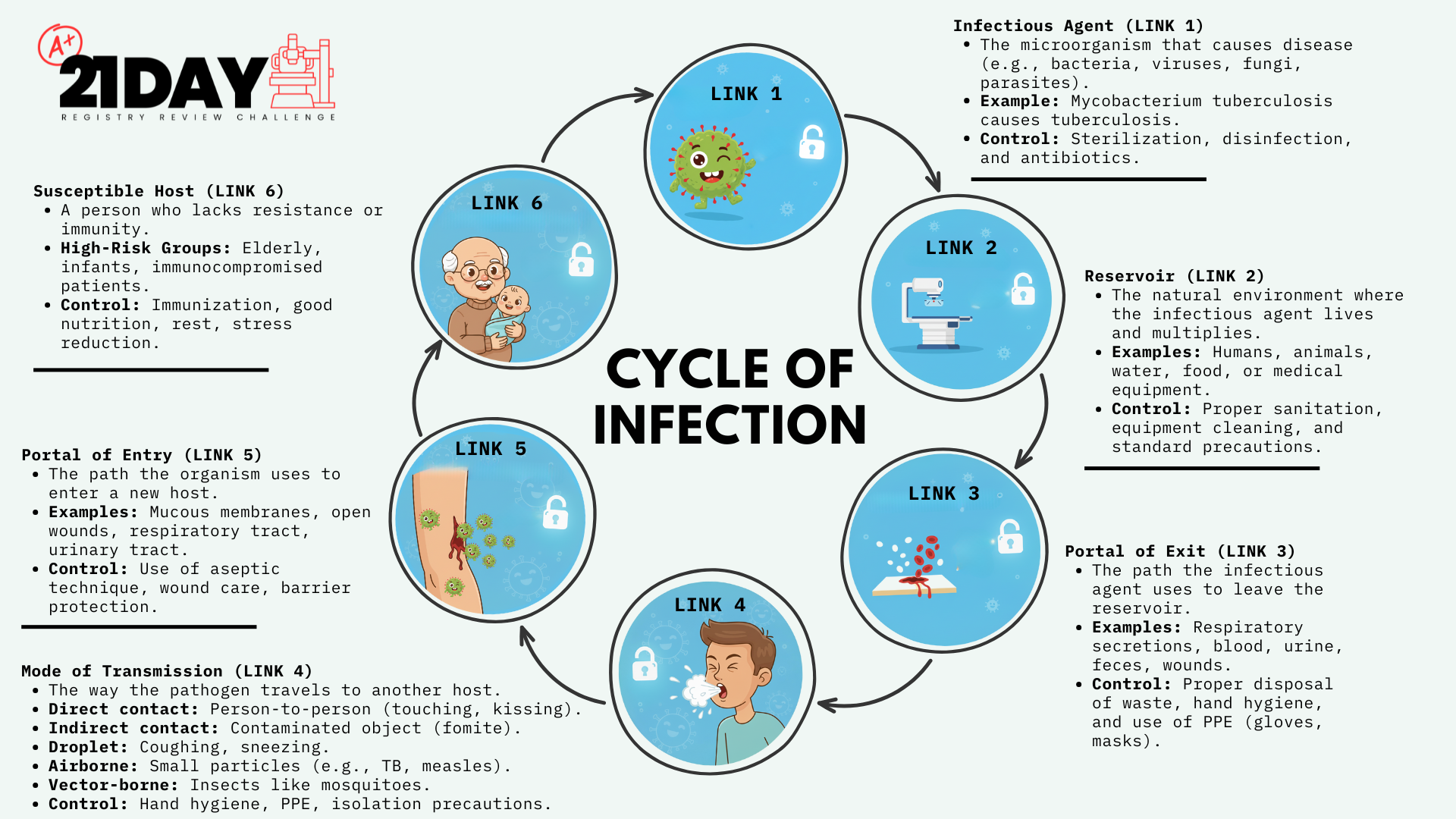 The cycle of infection explains how disease spreads — step by step — from its source to a new host. It has six essential links, and when any one of these links is broken, infection can be stopped in its tracks. This is the foundation upon which all infection control principles are built.
